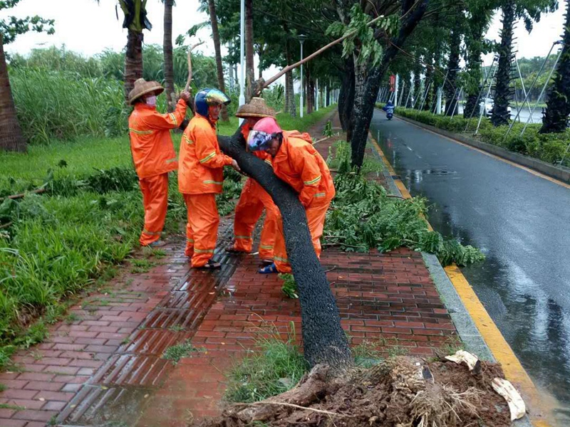 今年第9號臺風(fēng)“山神”的中心于今天凌晨4點50分前后,在海南萬寧市萬城鎮(zhèn)沿海登陸。受其影響,今天三亞、陵水有大到暴雨,將三亞、陵水街頭不少樹木刮倒,到處是殘枝敗葉,一片狼藉。臺風(fēng)中,為了確保市容環(huán)境的整潔、干凈,集團公司安排環(huán)衛(wèi)工人全員上崗,加緊清理街道路面,使城市迅速恢復(fù)潔凈。